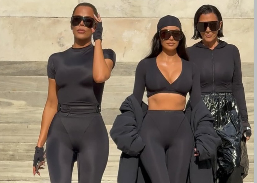 Kim wore a long-sleeve V-neck crop top with high-waisted leggings and an oversized puffer; Khloé went with a mock-neck short sleeve and leggings; Kris chose a fitted hoodie with nylon joggers. All three finished with oversized dark sunglasses — uniform, calculated, unmistakable.