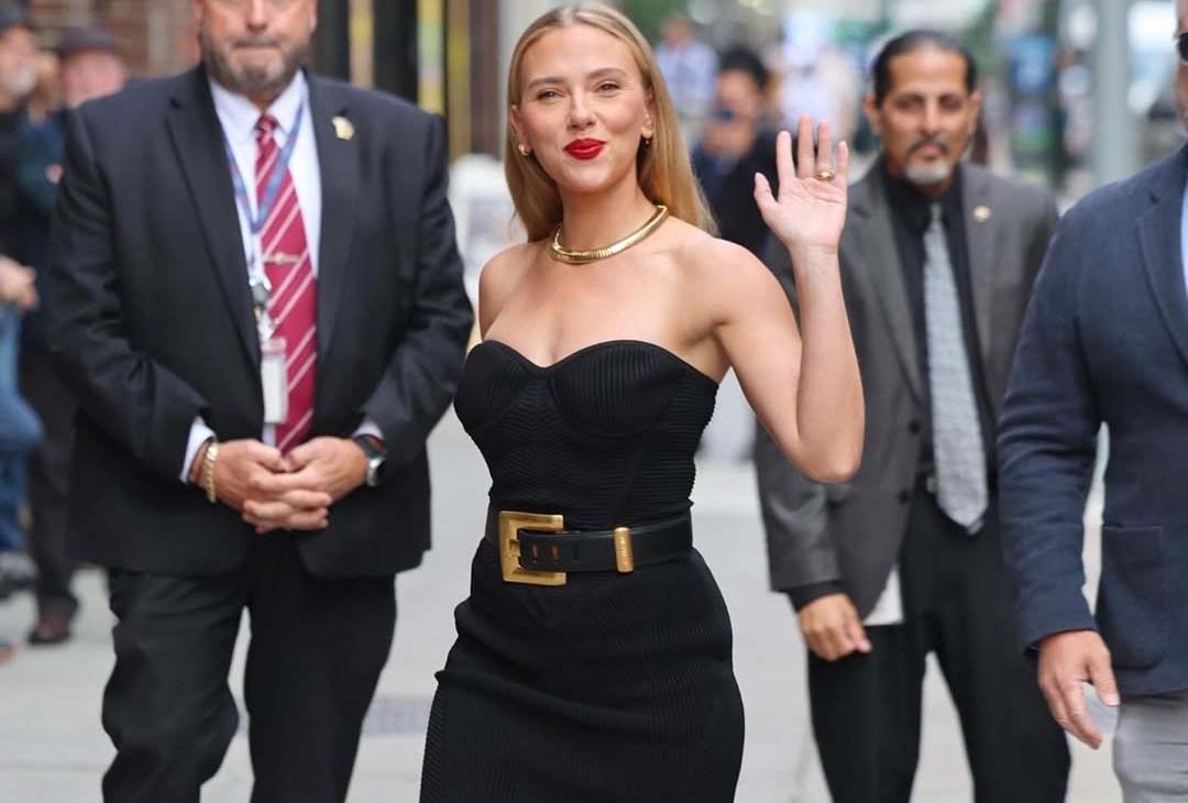 Scarlett Johansson knows how to work a room. On September 22, the actor-director arrived at The Late Show with Stephen Colbert in New York wearing a black strapless Balmain bodycon dress—minimalist in cut, but loaded with detail. The look was part of her press run for Eleanor the Great, her directorial debut set to release this weekend.
