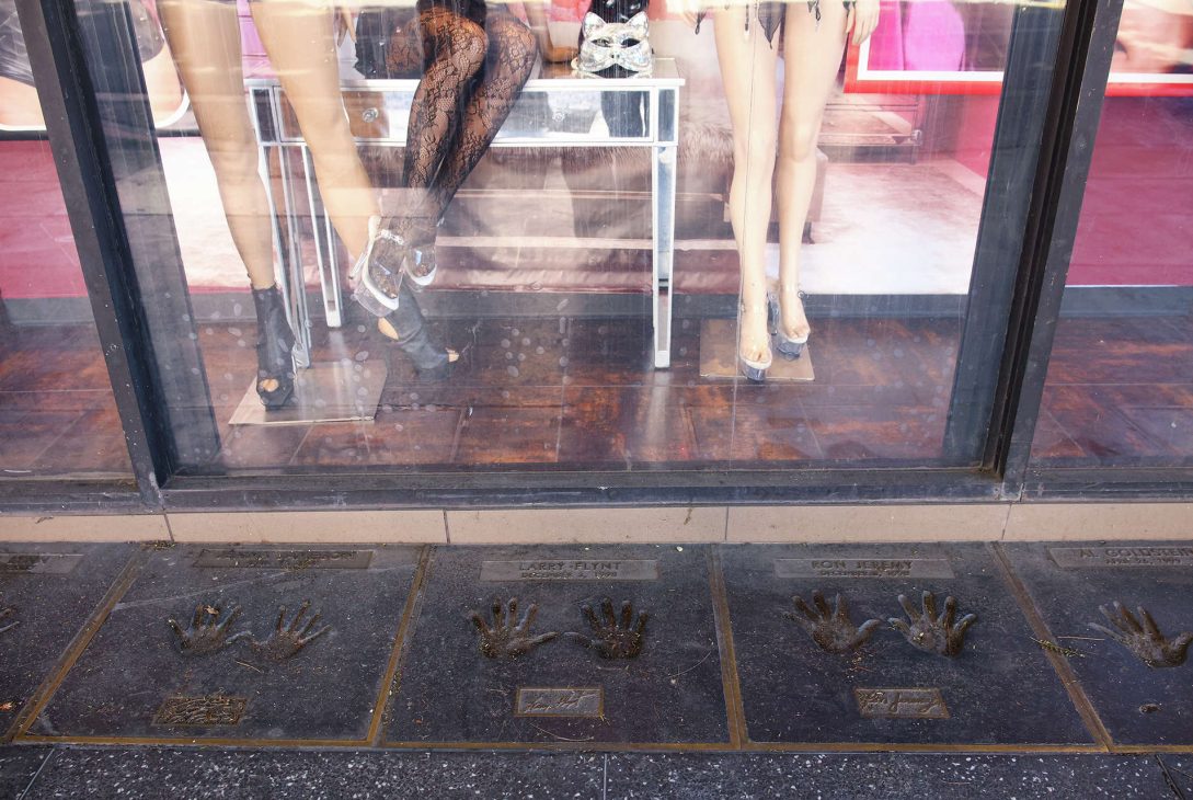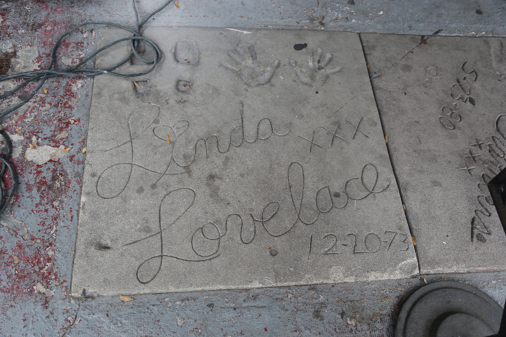 Further west, outside Hustler’s former Sunset Boulevard outpost, porn stars Randy Spears and Nina Hartley left their mark in concrete. That building is long gone — bought up by Gwyneth Paltrow around 2016, forcing the shop to relocate. The irony writes itself.